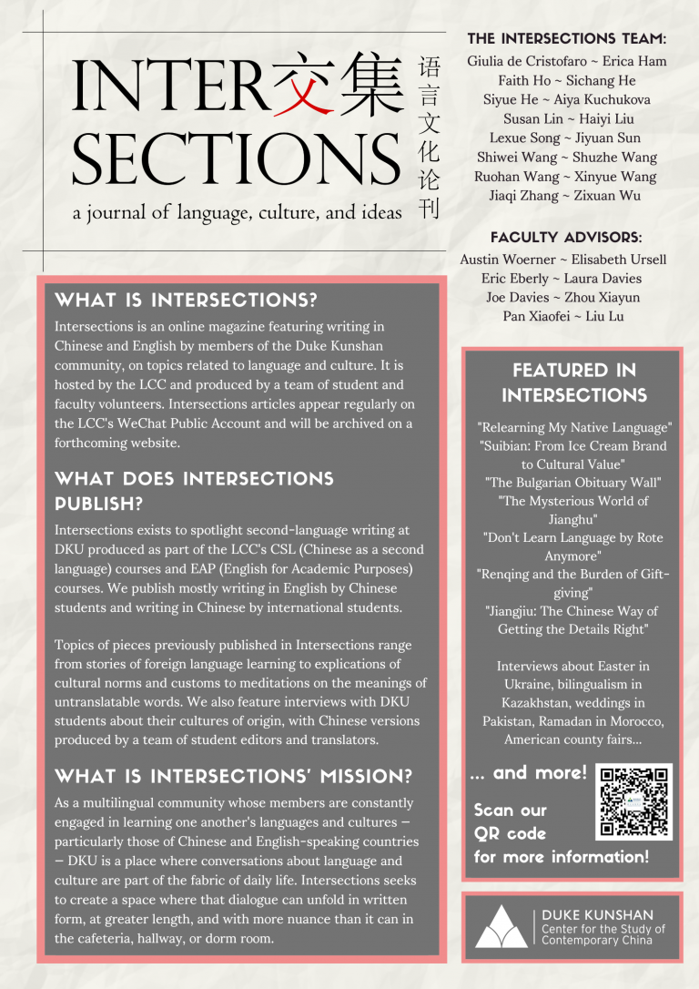Intersections articles and interviews are currently being published as part of the LCC’s WeChat public account, and they will also appear on a forthcoming Intersections website. We hope that Intersections can both enrich intellectual exchange at DKU and become an archive of meaningful student writing in Chinese and about Chinese culture that can serve as a resource in future coursework and research.