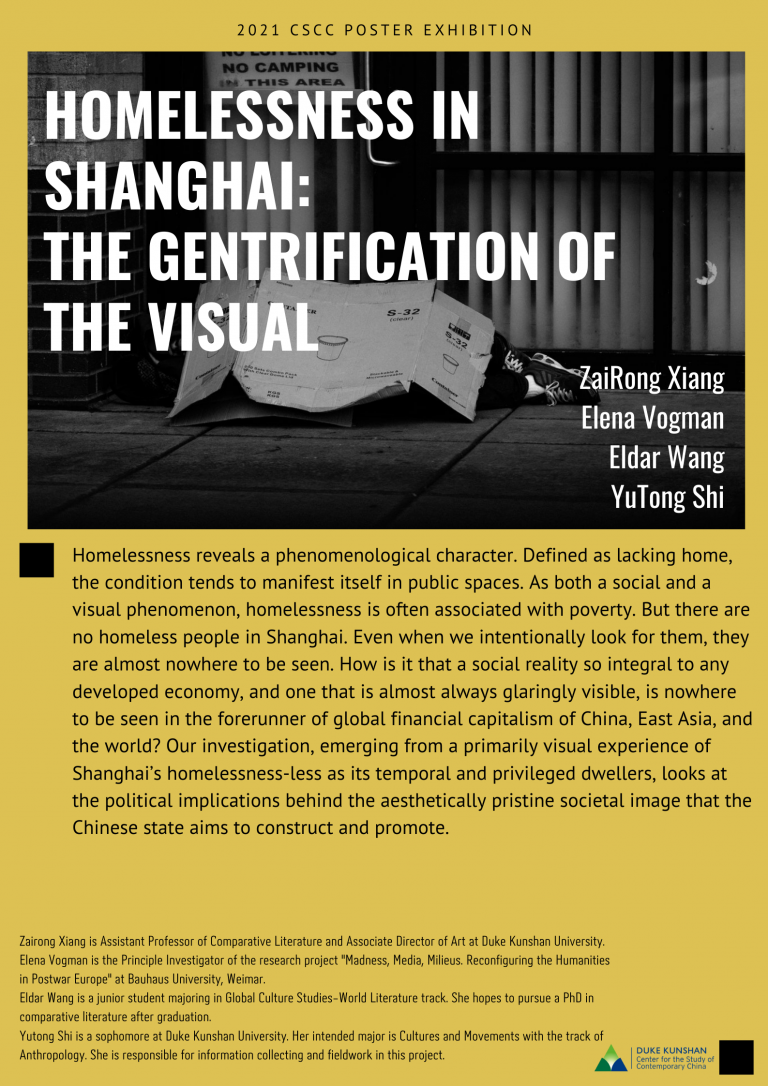 Homelessness reveals a phenomenological character. Defined as lacking home, the condition tends to manifest itself in public spaces. As both a social and a visual phenomenon, homelessness is often associated with poverty. But there are no homeless people in Shanghai. Even when we intentionally look for them, they are almost nowhere to be seen. How is it that a social reality so integral to any developed economy, and one that is almost always glaringly visible, is nowhere to be seen in the forerunner of global financial capitalism of China, East Asia, and the world? Our investigation, emerging from a primarily visual experience of Shanghai’s homelessness-less as its temporal and privileged dwellers, looks at the political implications behind the aesthetically pristine societal image that the Chinese state aims to construct and promote.