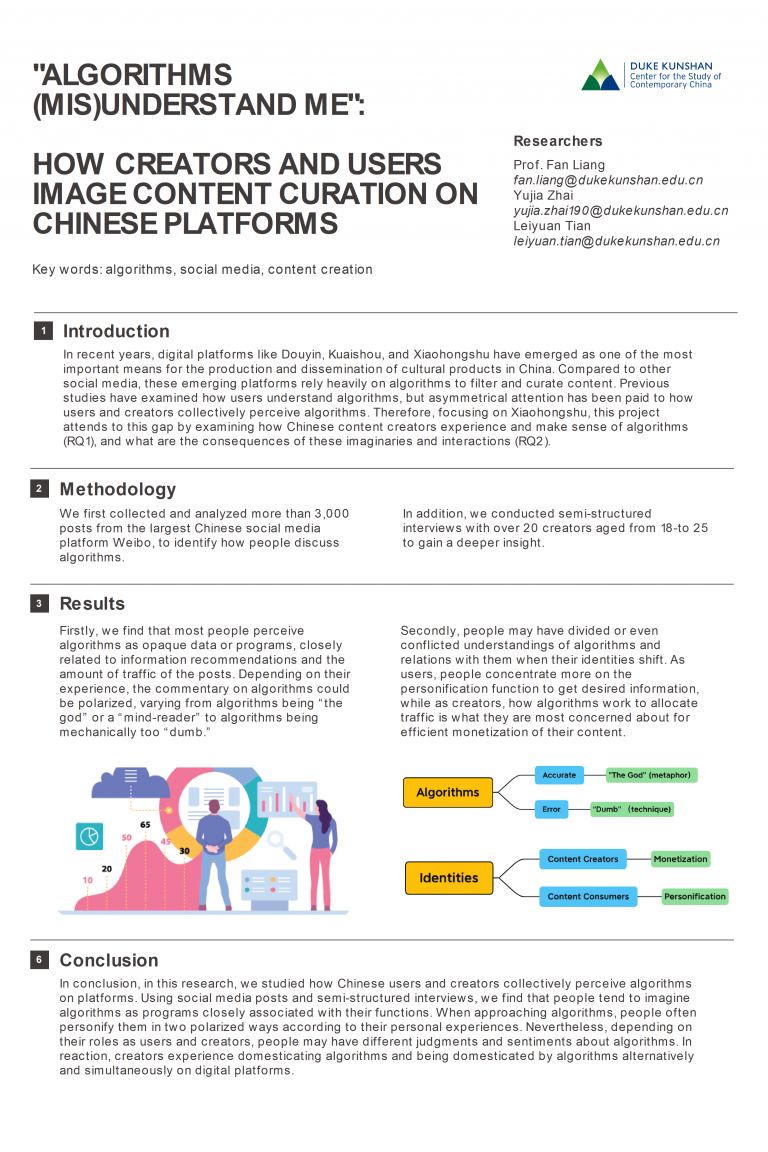 In recent years, digital platforms like Douyin, Kuaishou, and Xiaohongshu have emerged as one of the most important means for the production and dissemination of cultural products in China. Compared to other social media, these emerging platforms rely heavily on algorithms to filter and curate content. Previous studies have examined how users understand algorithms, but asymmetrical attention has been paid to how users and creators collectively perceive algorithms. Therefore, focusing on Xiaohongshu, this project attends to this gap by examining how Chinese content creators experience and make sense of algorithms, and the consequences of these imaginaries and interactions.