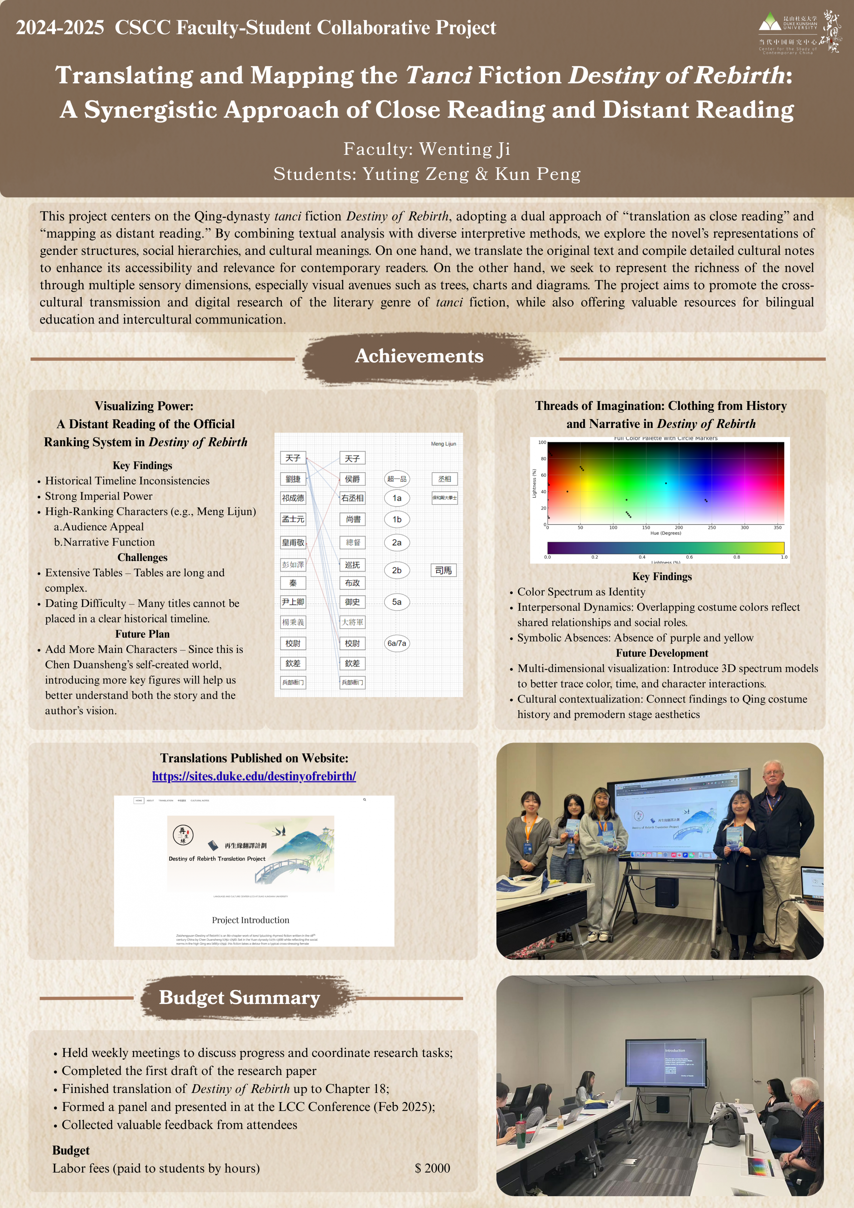 This project approaches the tanci fiction Destiny of Rebirth from two perspectives: translation as close reading and mapping as distant reading. On one hand, we aim to translate three volumes of Destiny of Rebirth from Chinese to English, incorporating “cultural notes” that highlight various historical and cultural conventions embedded in the text. All translations will be published on our website: https://sites.duke.edu/destinyofrebirth/. On the other hand, using methodologies from the broadly defined digital humanities, we will analyze the text from the perspectives of clothing and hierarchy and visualize our findings through forms and graphs for clearer presentation. With collaborative effort of faculty and students, we seek to present the full text of Destiny of Rebirth and the literary genre of tanci fiction to a broader contemporary audience, while at the same time contribute to the academic discourse on Chinese literature, late imperial history and culture, and gender studies.