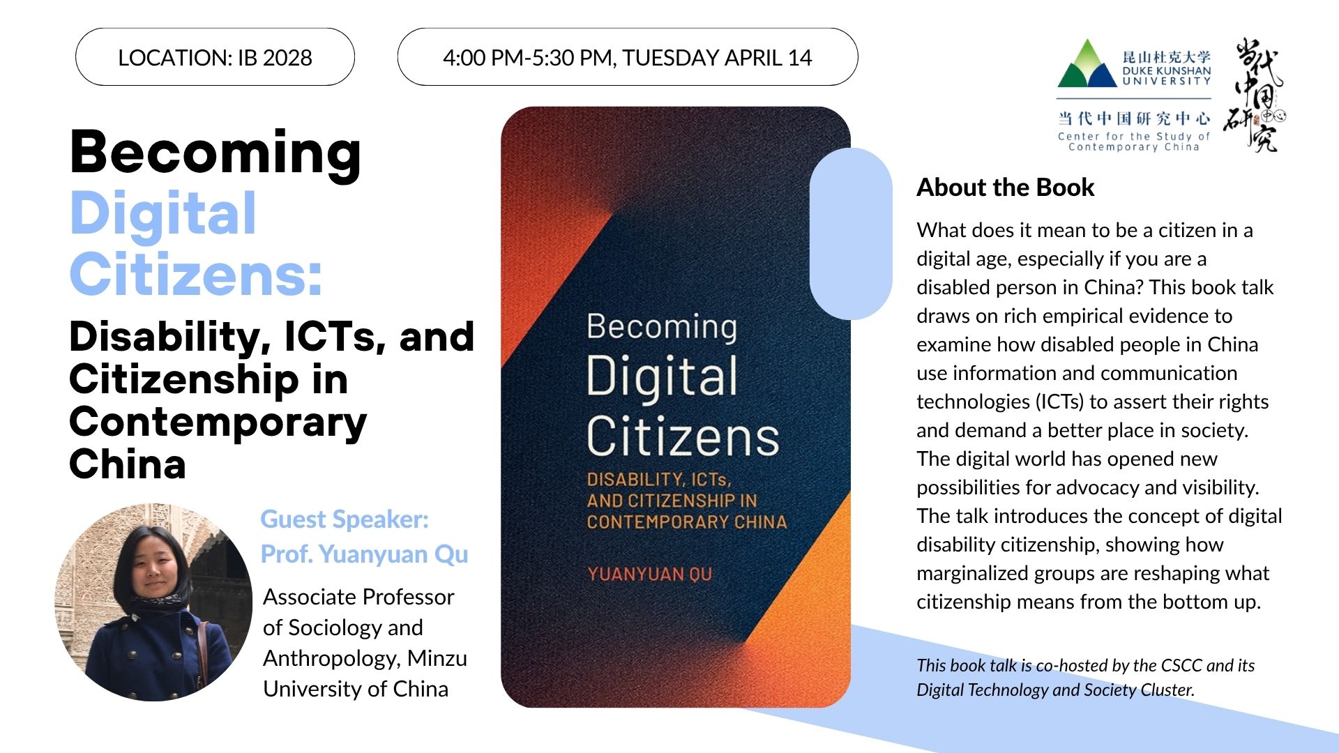 What does it mean to be a citizen in a digital age, especially if you are a disabled person in China? This book talk draws on rich empirical evidence to examine how disabled people in China use information and communication technologies (ICTs) to assert their rights and demand a better place in society. The digital world has opened new possibilities for advocacy and visibility. The talk introduces the concept of digital disability citizenship, showing how marginalized groups are reshaping what citizenship means from the bottom up.