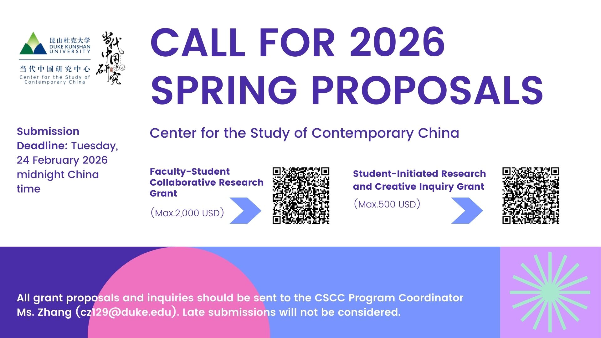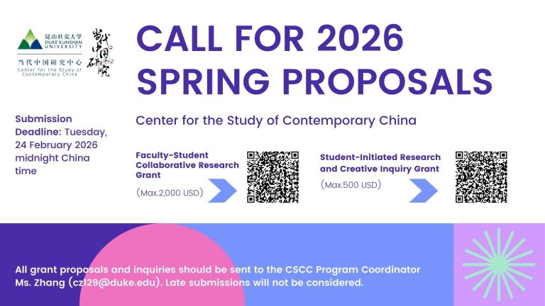 The Center for the Study of Contemporary China (CSCC) is now accepting proposals for Spring 2026! We warmly invite faculty members to apply for funding and to encourage your students to submit proposals by Tuesday, 24 February 2026 midnight China time. Through these grants, CSCC supports DKU faculty and students in pursuing research, creative inquiry, and collaborative projects that deepen our understanding of contemporary China.