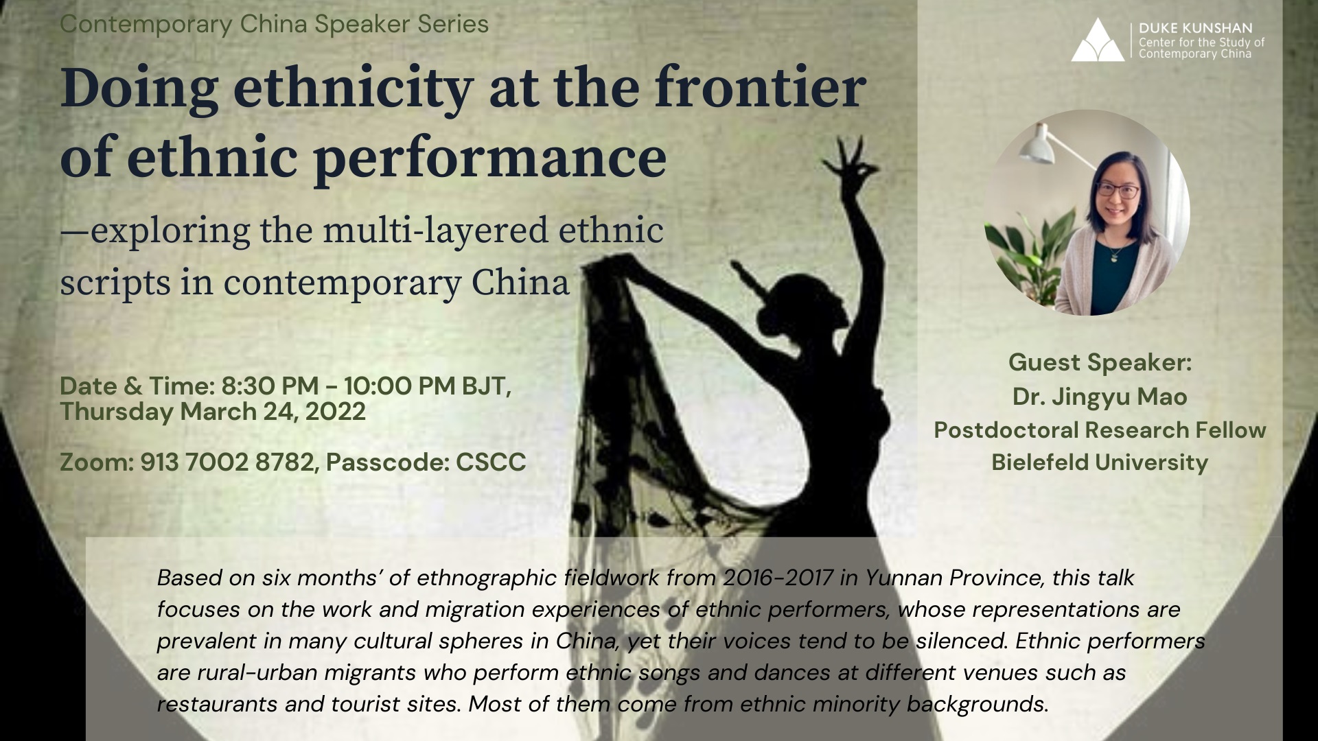Based on six months’ of ethnographic fieldwork from 2016-2017 in Yunnan Province, this talk focuses on the work and migration experiences of ethnic performers, whose representations are prevalent in many cultural spheres in China, yet their voices tend to be silenced. Ethnic performers are rural-urban migrants who perform ethnic songs and dances at different venues such as restaurants and tourist sites. Most of them come from ethnic minority backgrounds.