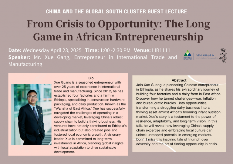 Join Xue Guang, a pioneering Chinese entrepreneur in Ethiopia, as he shares his extraordinary journey of building four factories and a dairy farm in East Africa. Discover how he turned challenges—war, inflation, and bureaucratic hurdles—into opportunities, transforming a struggling dairy business into a thriving asset amidst Africa’s booming infant nutrition market. Xue’s story is a testament to the power of resilience, adaptability, and long-term vision. In this talk, he will reveal how leveraging China’s supply chain expertise and embracing local culture can unlock untapped potential in emerging markets. Don’t miss this inspiring tale of triumph over adversity and the art of finding opportunity in crisis.