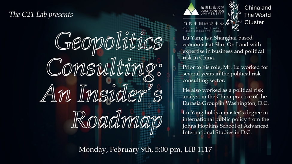Lu Yang, a Shanghai-based economist at Shui On Land with expertise in business and political risk in China, will be giving DKU students an insider’s look at the world of geopolitics consulting. He will also advise students on how to prepare for and find jobs in this dynamic industry.