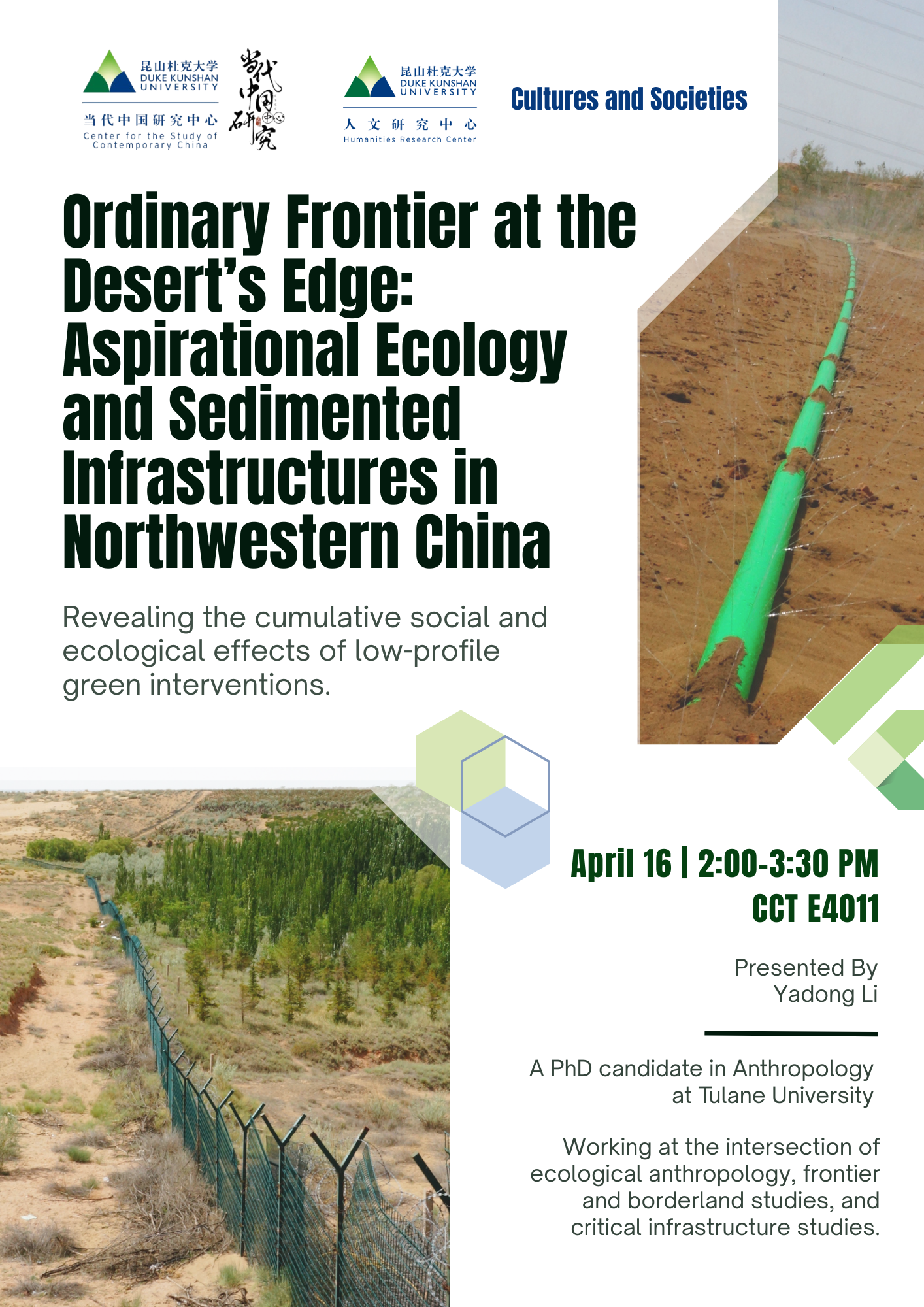 Across the globe, governments are building ‘green’ infrastructures almost everywhere to confront ecological crises, yet most studies focus on iconic megaprojects rather than ordinary, low‑profile frontiers. Focusing on Taole, a multiethnic township on the edge of the Mu Us Desert in northwestern China, my ethnographic research examines how irrigation systems, shelterbelt forests, conservation fences, and microalgae ponds have sedimented over time to reorganize ecologies, aspirations, and everyday life. Treating Taole as an ‘ordinary frontier,’ I show how successive infrastructures and Chinese “ecological civilization” agenda are enacted, stretched, and reworked in everyday life, leaving behind sedimentary geological, ecological, and social traces.