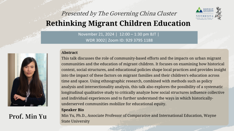 This talk discusses the role of community-based efforts and the impacts on urban migrant communities and the education of migrant children. It focuses on examining how historical context, social structures, and educational policies shape local practices and provides insight into the impact of these factors on migrant families and their children’s education across time and space. Using ethnographic research, combined with methods such as policy analysis and intersectionality analysis, this talk also explores the possibility of a systematic longitudinal qualitative study to critically analyze how social structures influence collective and individual experiences and to further understand the ways in which historically-underserved communities mobilize for educational equity.