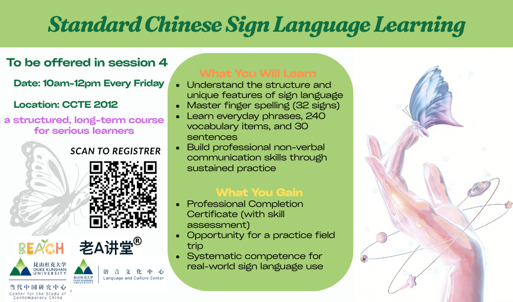 If you are curious about sign language, interested in inclusive communication, or simply want to learn something meaningful and new, join us every Friday morning for this structured, long-term course designed for serious learners, supported by REACH, 老A讲堂, the Center for the Study of Contemporary China, and the Language and Culture Center.
