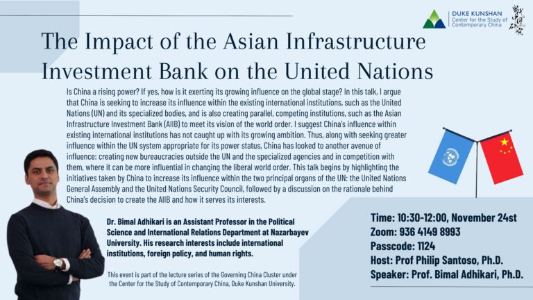 Is China a rising power? If yes, how is it exerting its growing influence on the global stage? In this talk, I argue that China is seeking to increase its influence within the existing international institutions, such as the United Nations (UN) and its specialized bodies, and is also creating parallel, competing institutions, such as the Asian Infrastructure Investment Bank (AIIB) to meet its vision of the world order. I suggest China’s influence within existing international institutions has not caught up with its growing ambition. Thus, along with seeking greater influence within the UN system appropriate for its power status, China has looked to another avenue of influence: creating new bureaucracies outside the UN and the specialized agencies and in competition with them, where it can be more influential in changing the liberal world order. This talk begins by highlighting the initiatives taken by China to increase its influence within the two principal organs of the UN: the United Nations General Assembly and the United Nations Security Council, followed by a discussion on the rationale behind China’s decision to create the AIIB and how it serves its interests.
