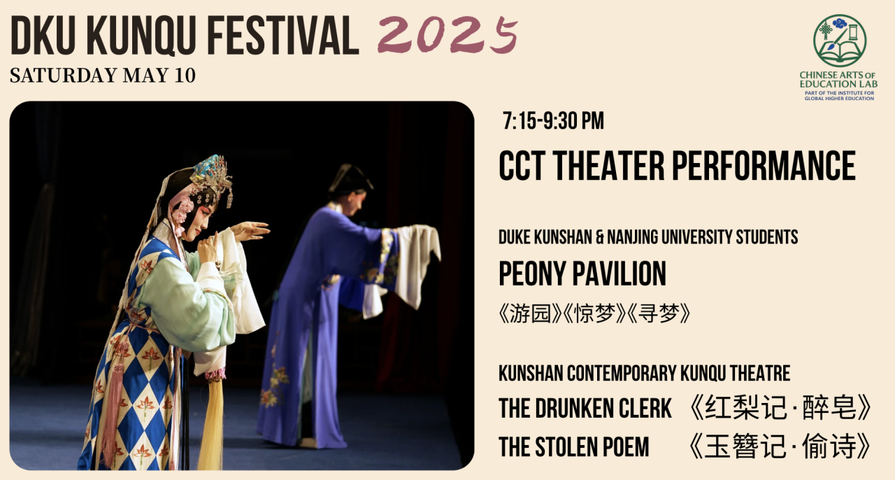 This year’s conference marks a new chapter in our work on Kunqu at DKU. Sponsored by the Chinese Arts of Education Lab within DKU’s new Institute for Global Higher Education, we focus on the roles that Kunqu can play in Chinese liberal arts education today. We cordially invite all of you to participate in the series of activities of the Kunqu Festival on Saturday, May 10.