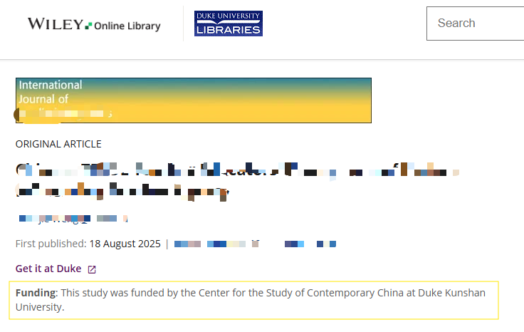If awarded the grant, all publications, conference posters or presentations, or other means of dissemination resulting from work supported by a CSCC research grant should acknowledge funding from the Center for the Study of Contemporary China, Duke Kunshan University, see example below.