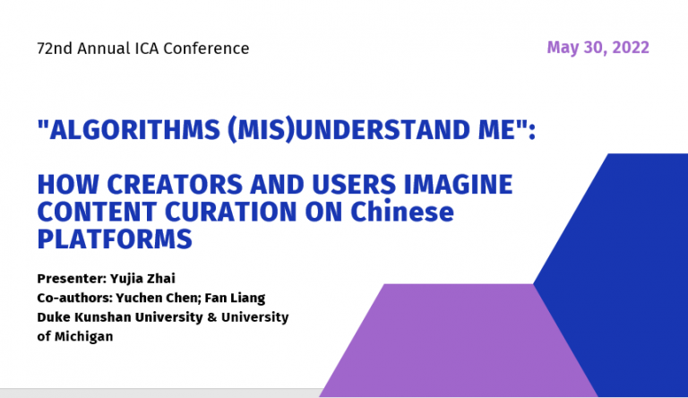 Yujia Zhai is a senior student majoring in Art History, Media and Arts. Her research interest lies in the intersection of art, commerce, media, and technologies. Yujia has been working on a CSCC student research project Algorithmic Imaginaries: How Chinese Cultural Creators Negotiate with Personalization Systems, which is led by Fan Liang, Assistant Professor of Media at DKU. In May, the team had an abstract accepted by the 2022 ICA Conference, and Yujia presented their findings virtually at the largest conference in communication and media: