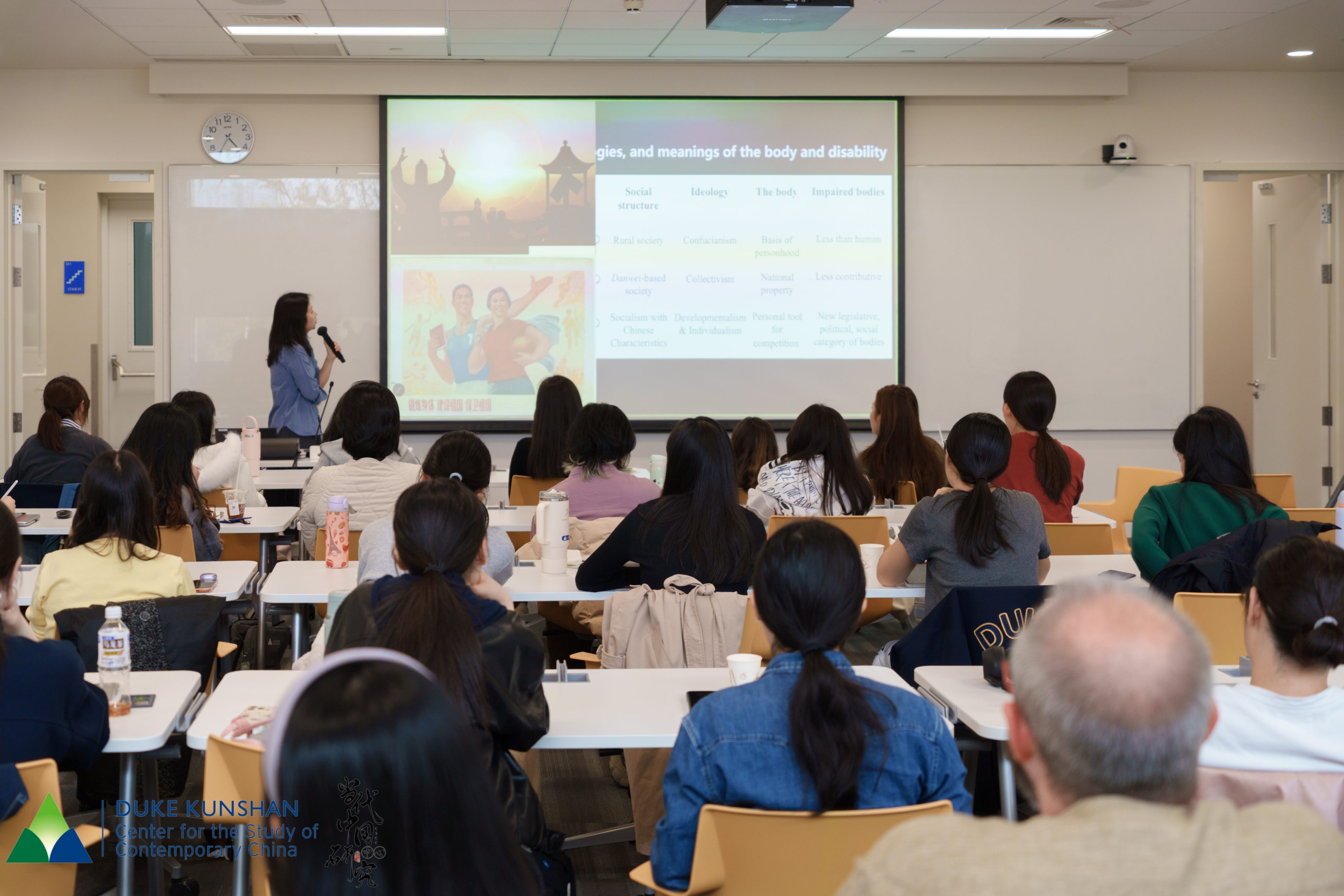 She then turned to the specific context of China, tracing how understandings of the body and disability have shifted across historical periods: from Confucian ideals of bodily wholeness in traditional society, to collectivist and productivity-centered norms during the socialist era, to the more individualized but still statist citizenship of the reform and opening-up period. The official definition of disability in China, codified in law in 1991, remains highly medicalized, centering on organ function and “abnormality.” Despite this narrow definition, nearly 83 million people in China are classified as disabled, which is roughly 6.3% of the population. Dr. Qu described the citizenship status of disabled people in China as “blocked.” While laws and official discourse position disabled people as equal members of society deserving of rights and special care, these promises are rarely fulfilled in practice. Disabled people are largely excluded from political representation, marginalized in a labor market that prioritizes workability, and rendered invisible in public life.