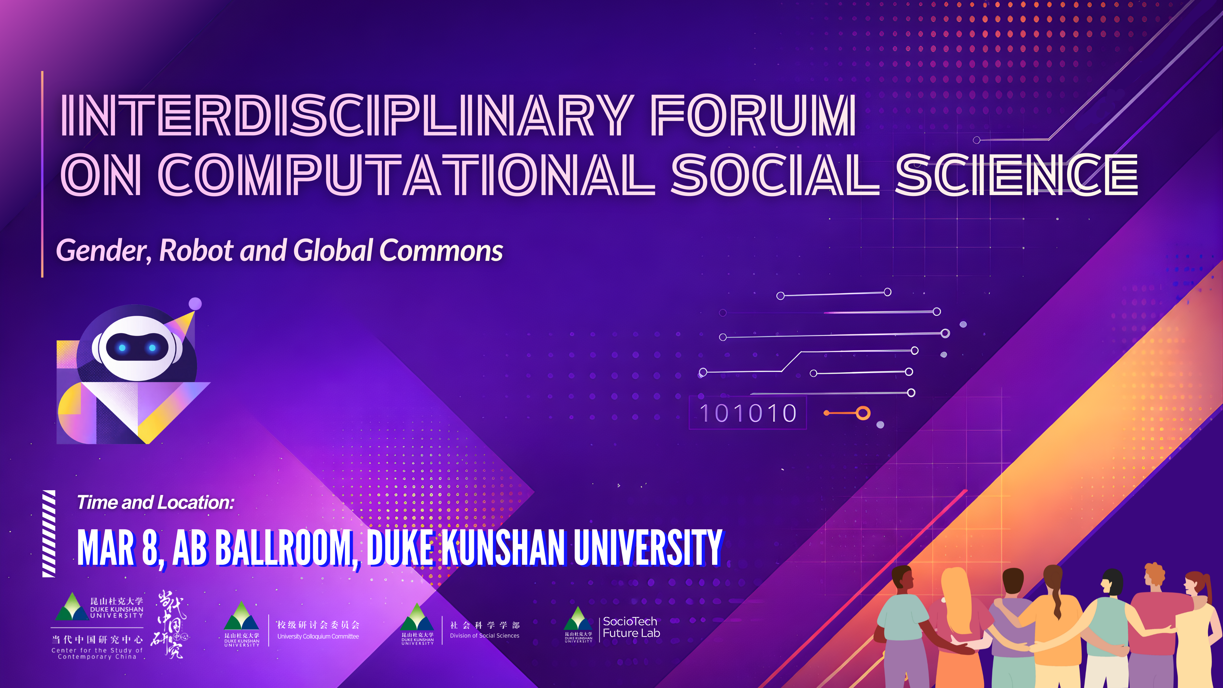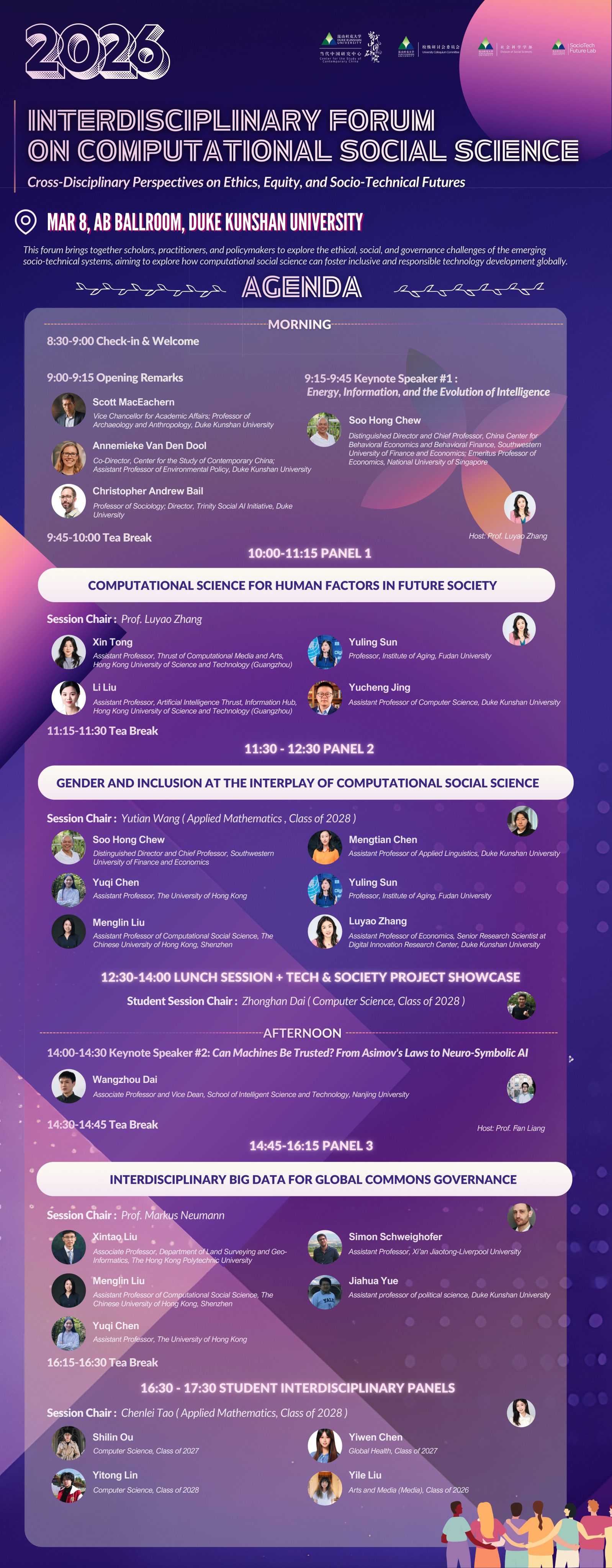 The Interdisciplinary Forum on Computational Social Science, themed on “Gender, Robots, and Global Commons: Cross-Disciplinary Perspectives on Ethics, Equity, and Socio-Technical Futures,” convened on March 8, 2025, at Duke Kunshan University. Co-hosted by the DKU Center for the Study of Contemporary China, the University Colloquium Committee, the Division of Social Sciences, and the SocioTech Future Lab, the forum was orchestrated under the faculty co-chairmanship of Prof. Fan Liang and Prof. Luyao Zhang, who jointly lead the Digital Technology and Society cluster at CSCC. Working alongside this faculty leadership, student co-chairs Zhonghan Dai and Sarah Tao provided organizational direction, exemplifying the forum’s radical commitment to undergraduate agency—students chaired panels, presented peer-reviewed research, and co-architected the event’s vision alongside junior and senior faculty. Transcending conventional disciplinary boundaries, the gathering united economists and computer scientists, political scientists and digital humanists, sociologists and media theorists from research-intensive comprehensive universities, specialized science and technology institutes, Sino-foreign cooperative campuses, and leading economics and business schools. At its core, the forum tackled the urgent governance of global commons in an age of intelligent machines: from the embodied ethics of gendered digital technology and the neuro-symbolic foundations of trustworthy automation to the epistemic decolonization of big data and the sustainable futures of urban spaces. This was not merely an academic conference, but a collaborative laboratory for calibrating the humanistic compass of computational innovation.