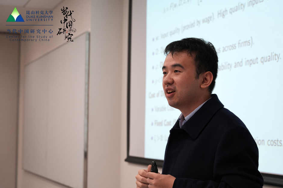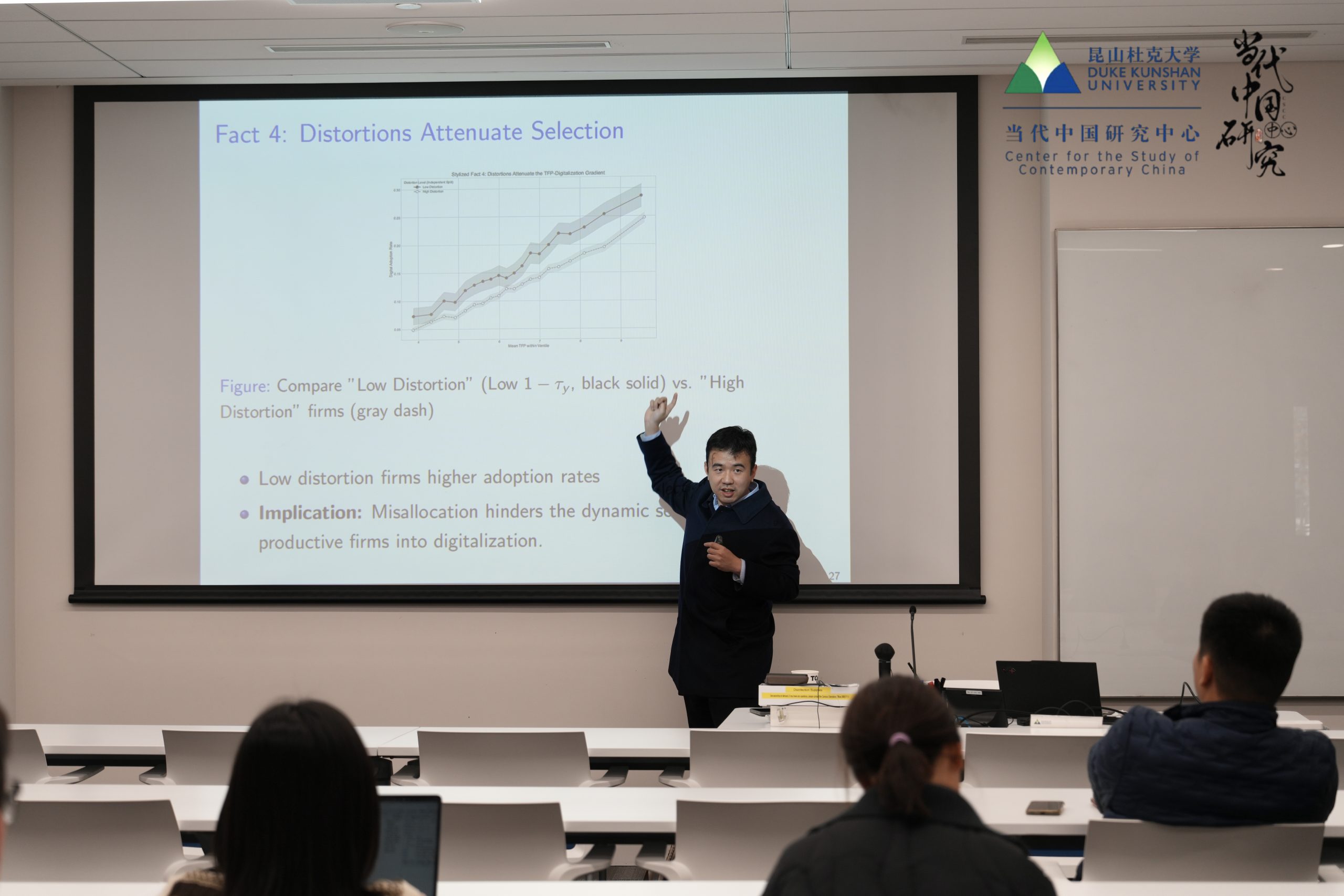 On November 21, Peking University Associate Professor Liu Yunting delivered an Economics seminar at Duke Kunshan University, where he presented his recent research, “Digitalization, Selection, and Misallocation: Evidence from Firm-Level Data in China.” Drawing on extensive firm-level data, his study develops and empirically tests a model that connects digital technology adoption with productivity differences and resource misallocation across Chinese firms.